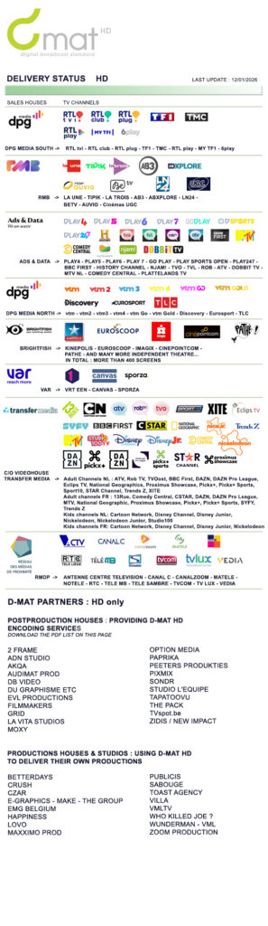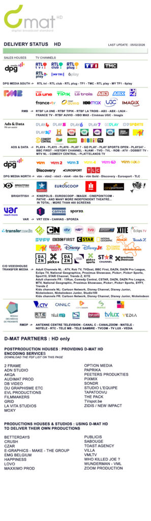 De BVAM heeft een aantal Belgische postproductiehuizen erkend die over de D-MAT technologie beschikken. Zij zullen erop toezien dat uw spots beantwoorden aan de D-MAT normen, en dat op basis van uw (master) tapes of originele bestanden. Ook zij zullen de upload van uw spots via beveiligde verbindingen naar de reclameregies verzorgen.