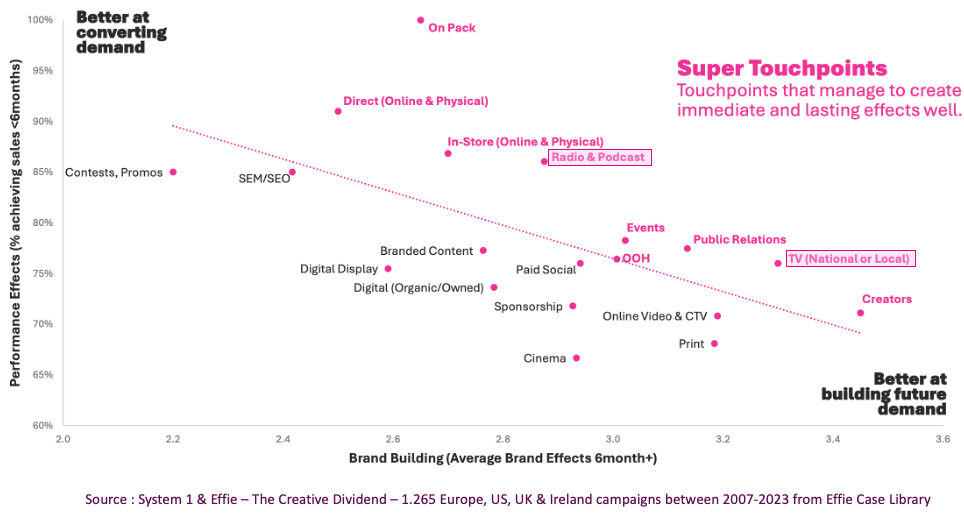 Attardons-nous ici sur le mapping plaçant chaque touchpoint sur deux axes : ceux qui boostent le brand building en abscisses, et ceux qui délivrent de la performance à court terme (< 6 mois) en ordonnées. Andrew Tindall isole ensuite les « super touchpoints », ceux qui parviennent à performer aussi bien dans le haut que dans le bas du funnel. Pas étonnant d’y retrouver la Télévision, dont on connaît depuis longtemps la capacité à développer l’image des marques, et aussi à activer des ventes. De même, la Radio est souvent utilisée comme levier d’activation des ventes, mais se révèle également être un excellent touchpoint pour le brand building, entre autres au travers du visual transfer, mais pas que.